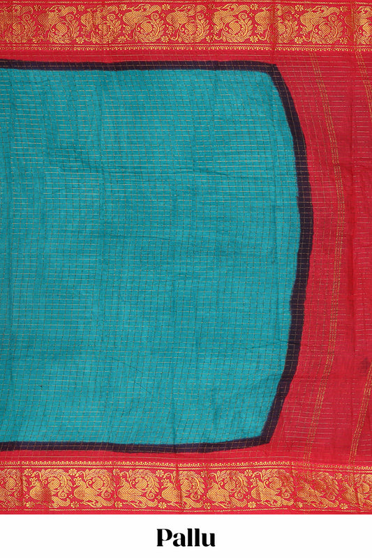 Turquoise green checked sungudi cotton saree with contrast border and striped pallu