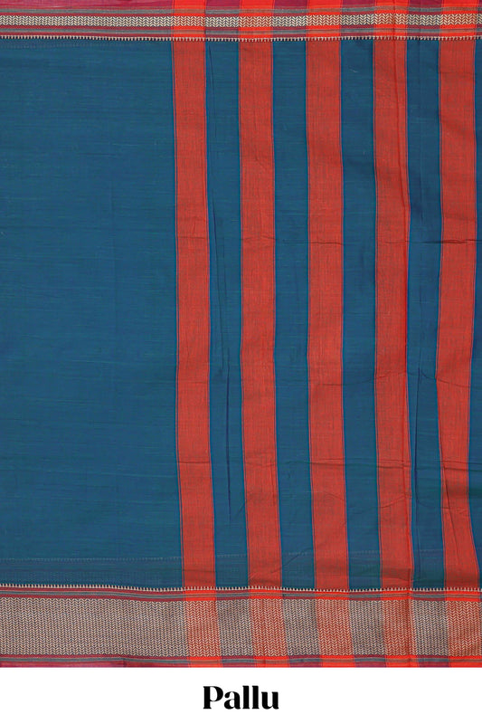 Blue plain narayanpet cotton saree with contrast border and striped pallu