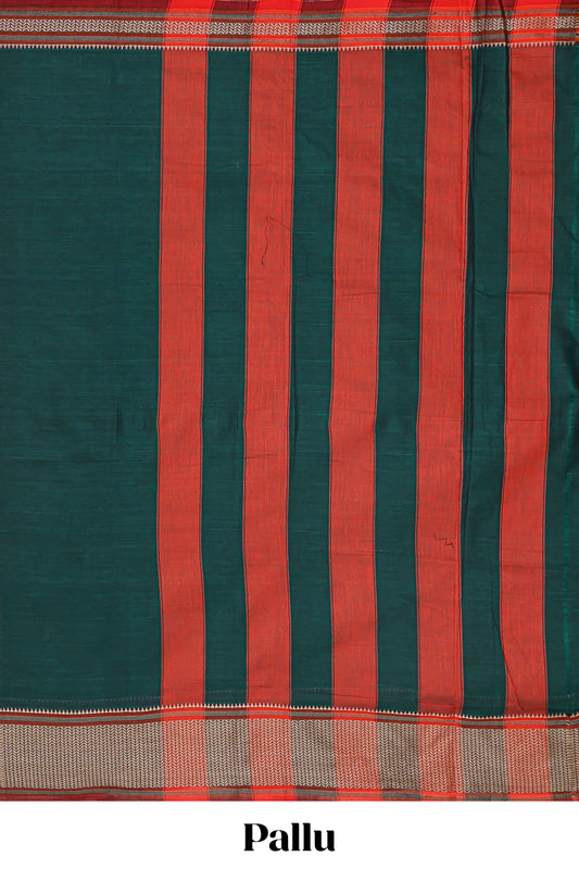 Dark green plain narayanpet cotton saree with contrast border and striped pallu