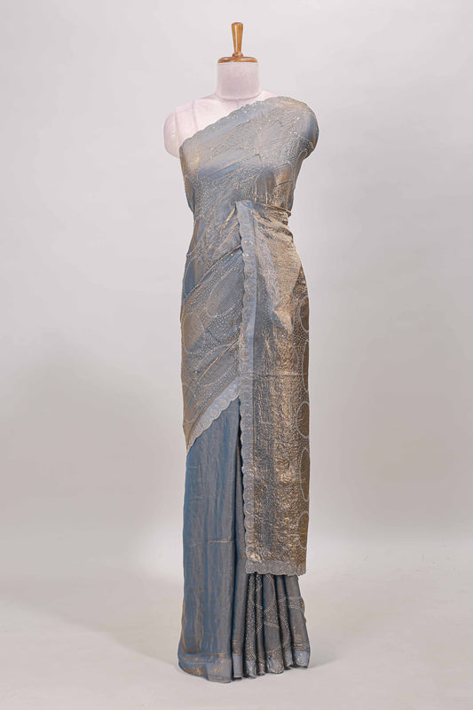 Grey stone work geometric design semi chiffon saree with self scallop border and matching blouse