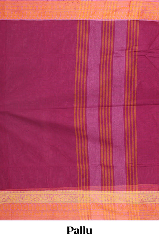 Plum purple motifs mul mul cotton saree with contrast striped border and blouse