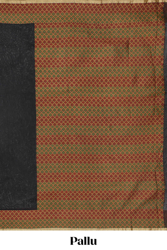 Black plain linen cotton saree with contrast zari bentex border & matching pallu with tassels