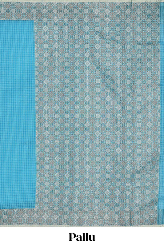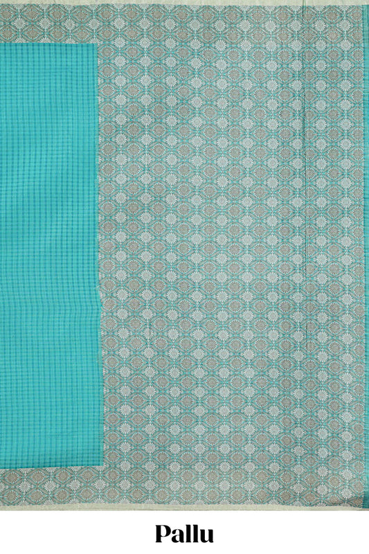 Turquoise blue checked kota cotton saree with contrast border and floral design blouse