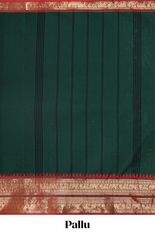 Green plain narayanapet cotton saree with contrast zari bendex border and stripe pallu