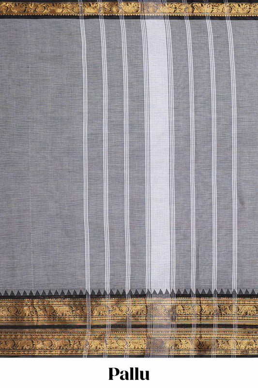Grey plain narayanapet cotton saree with contrast zari bendex border and stripe pallu