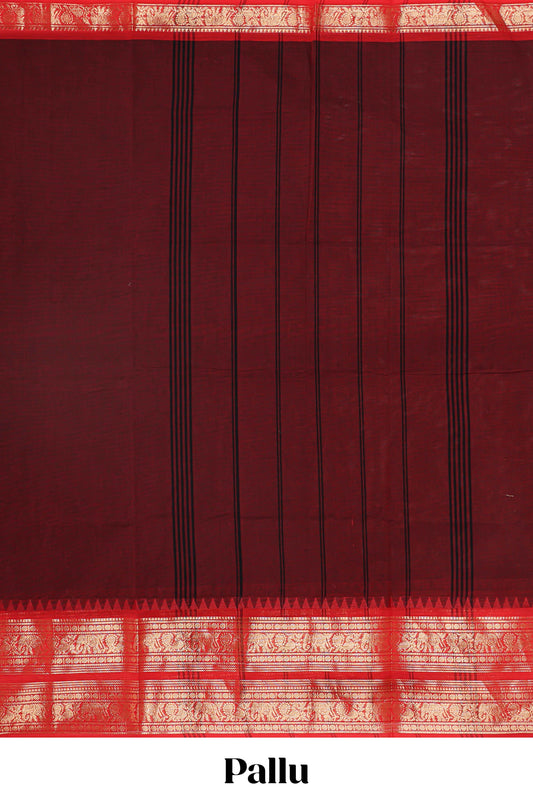 Maroon plain narayanapet cotton saree with contrast zari bendex border and stripe pallu