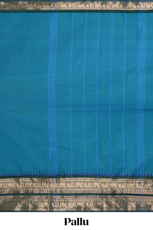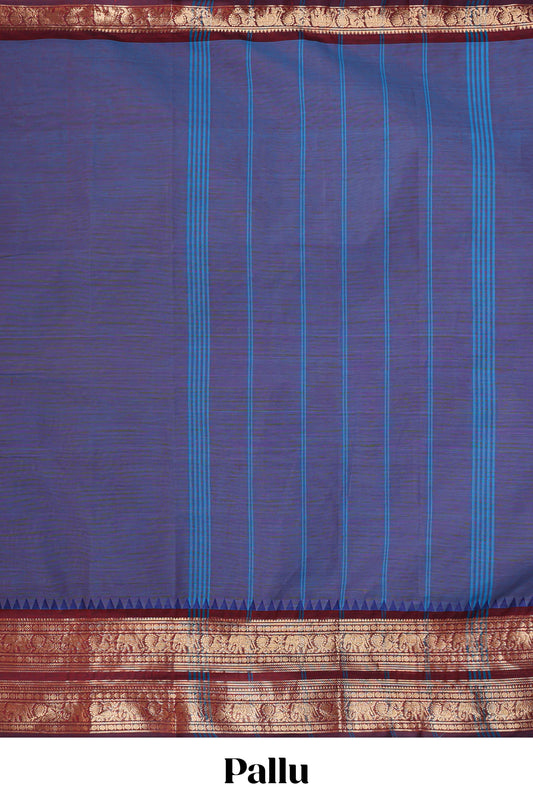 Blue plain narayanapet cotton saree with contrast zari bendex border and stripe pallu