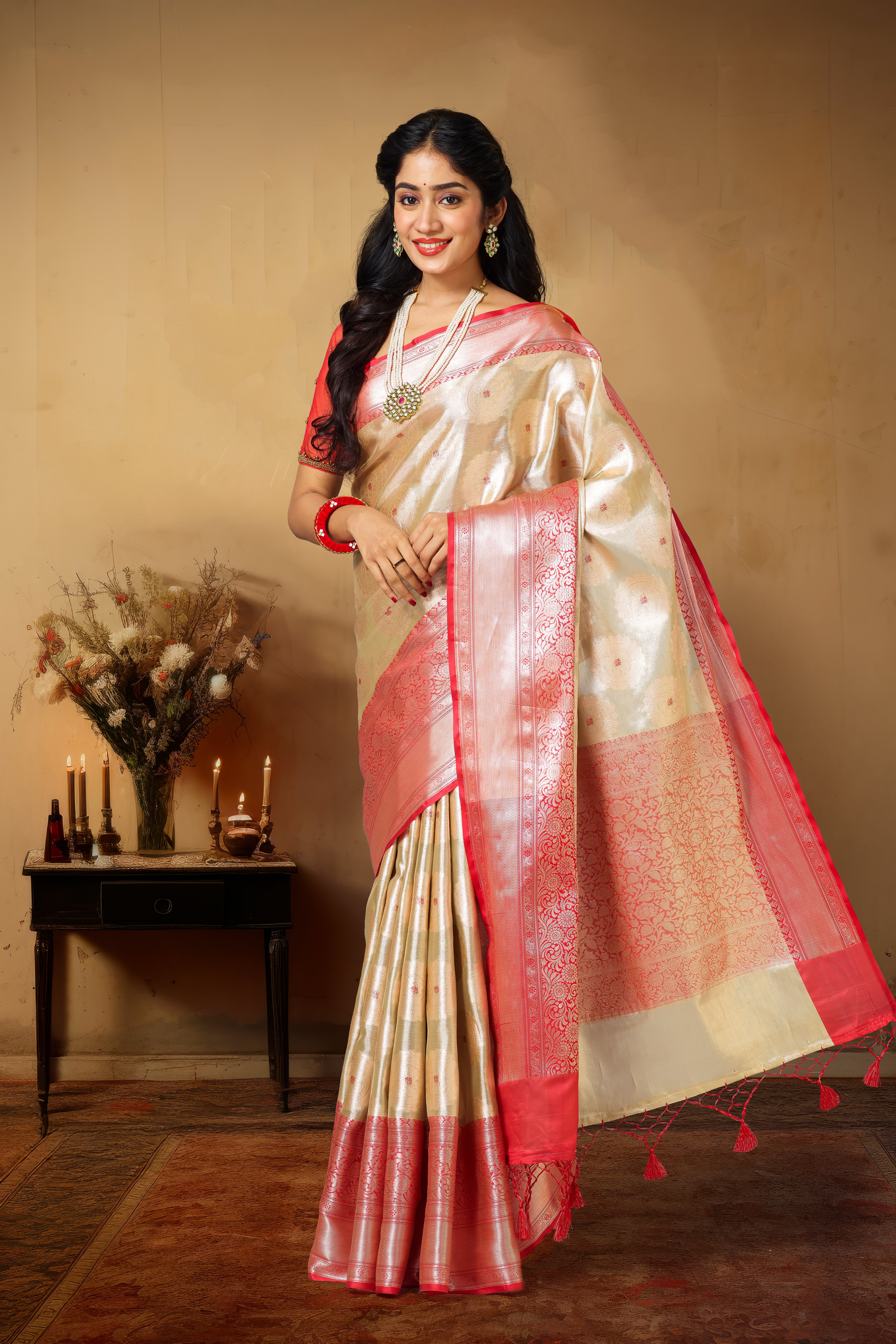 One of the delicate, shiny, raw-textured tussar silk sarees is well known for its elegance and earthy charm. These tussar silk sarees come in warm and neutral colors. This is perfect for those who love simplicity. Pairing it with silver jewelry gives more effects and adds raw beauty.