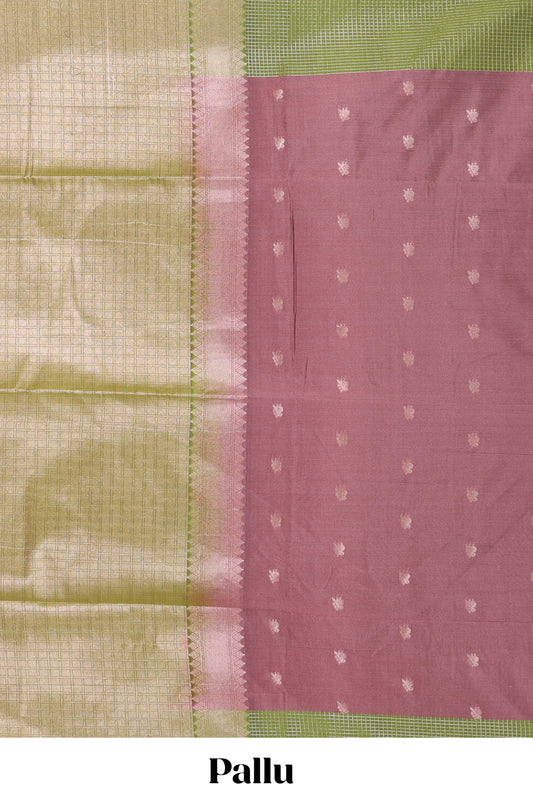 Plum purple vairaoosi zari butta semi soft silk saree, contrast checked border and Pallu