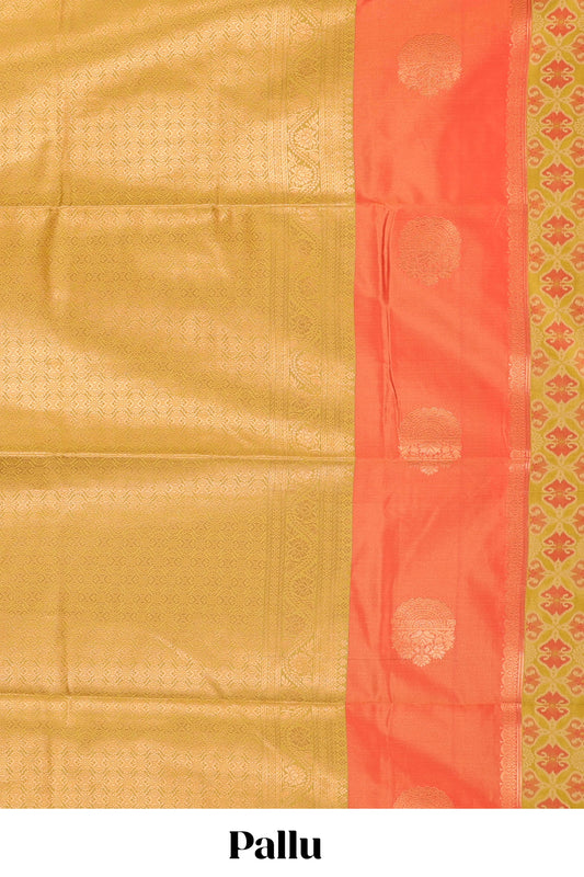 Mustard semi soft silk banarasi style saree with gold zari stripes and contrast border