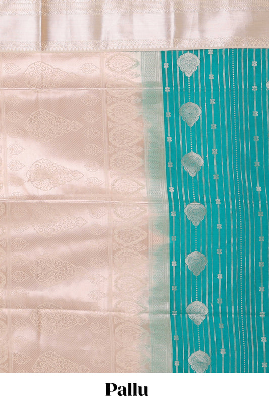 Blue semi soft silk banarasi style saree with gold zari stripes and contrast border