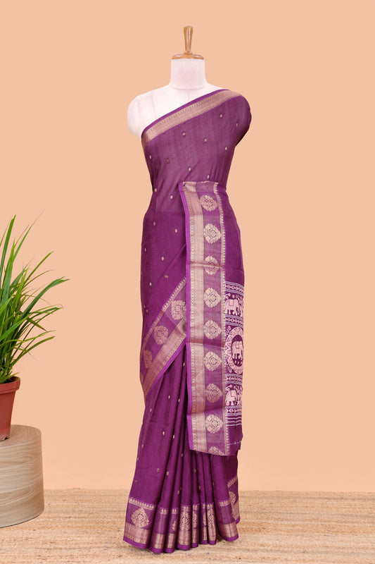 Purple viscose dola silk saree with all-over zari butta, elephant motif pallu & contrast blouse