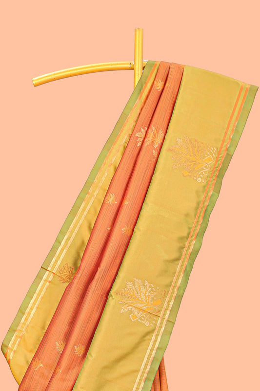 Orange semi soft silk saree body all over leaf motifs zari butta and bentex border with grand zari