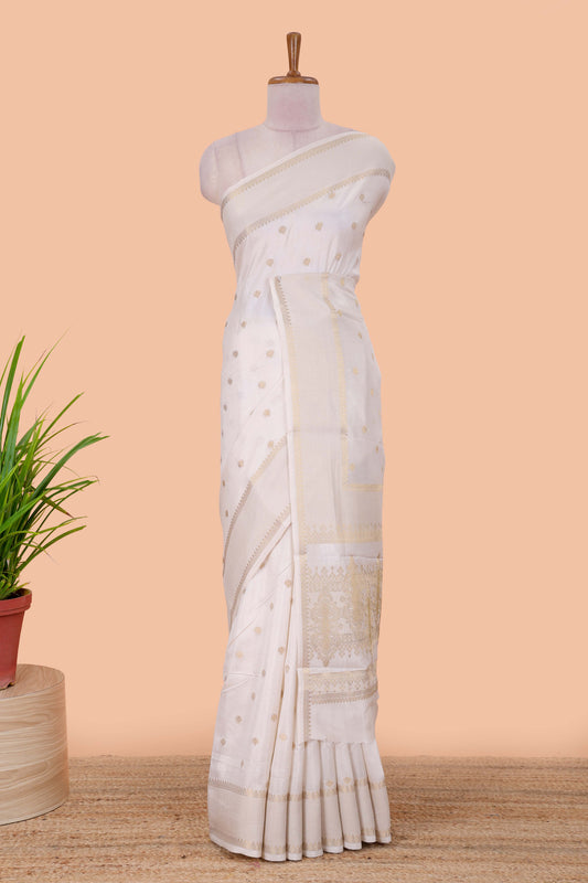 White dola silk saree with all over zari butta, bendex zari border, rich zari pallu and contrast blouse