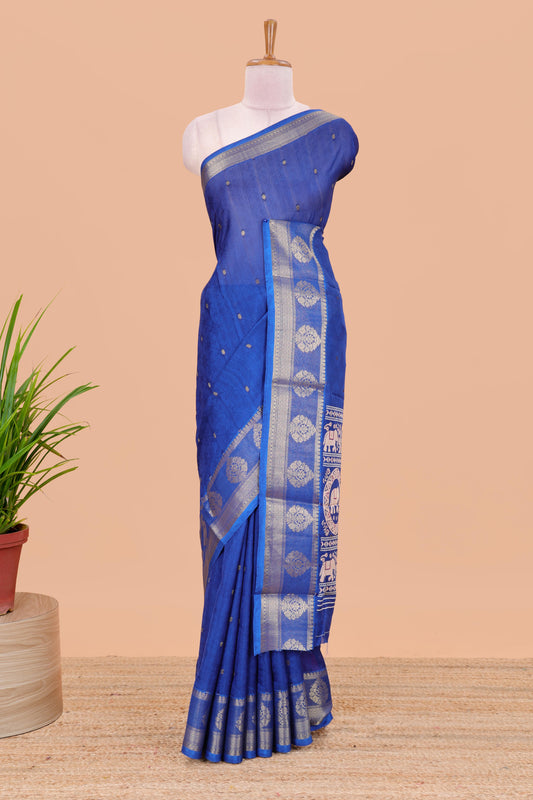 Blue viscose dola silk saree with zari butta weave, pichwai motif border and contrast blouse