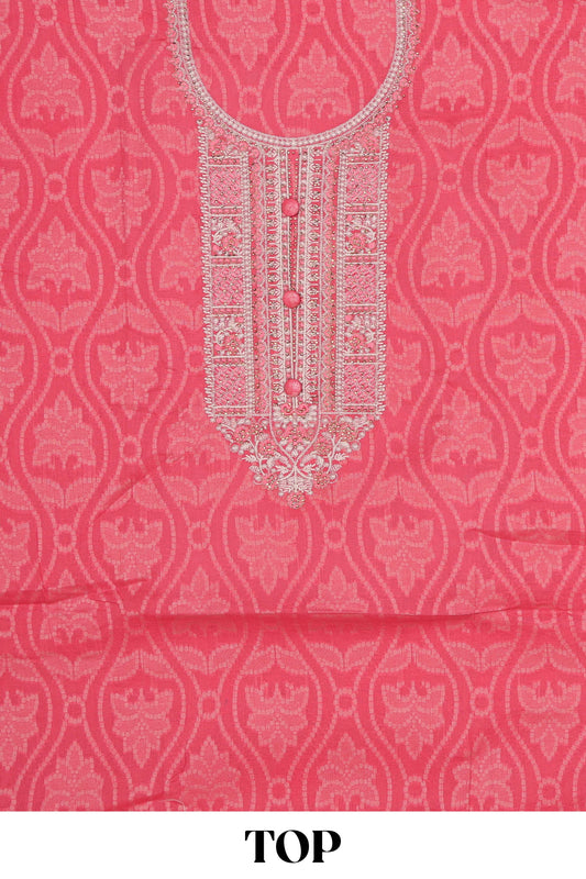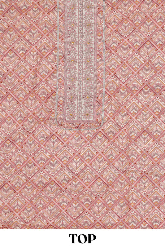 Pink cotton geomentrical embroidered chudidhar material with contrast bottom and dupatta