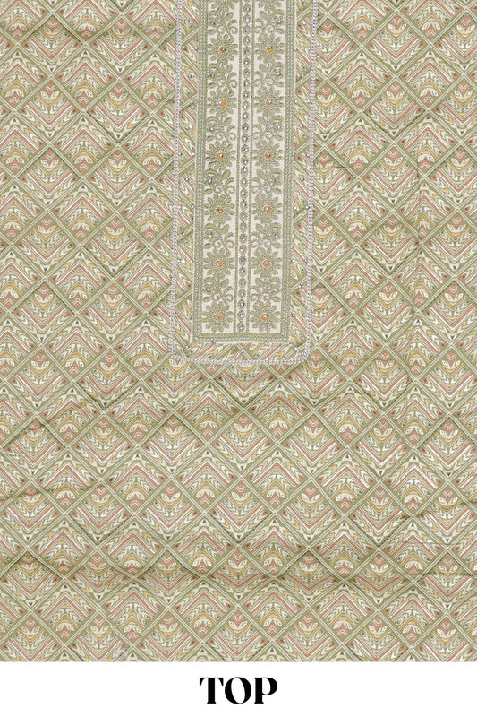Green cotton geomentrical embroidered chudidhar material with contrast bottom and dupatta
