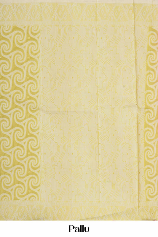 Lemon Yellow Bengal Cotton Saree with Swirl Pattern, Thread Butta Work & Geometric Motif Pallu