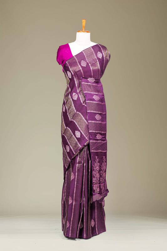SaleViolet & Orange Contrast Border Kanchipuram Pure Silk Saree with Gold Zari Floral Motifs and Elegant Pallu