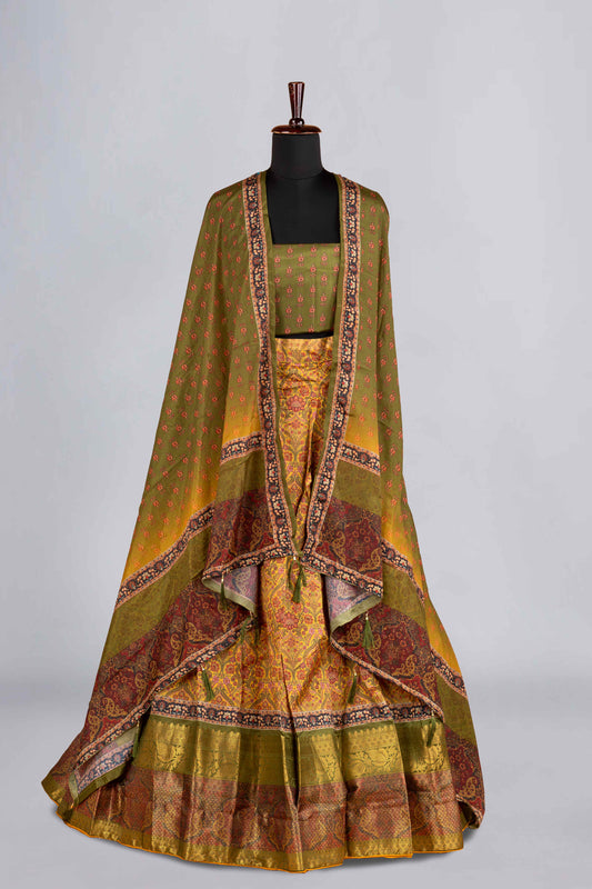 SaleHandwoven Mint Green & Orange Pure Ikkat Silk Saree with Traditional Floral Buttas and Contrast Temple Border