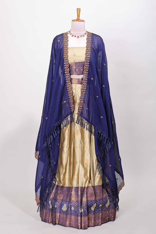 Golden raw silk zari butta lehenga with blue contrast border and dhavani