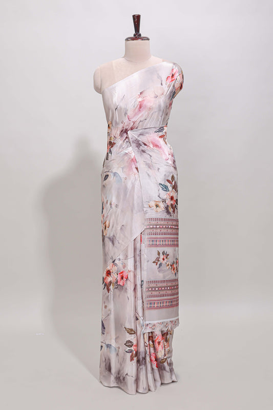 Borderless cream floral design art mysore silk saree with matching floral printed blouse