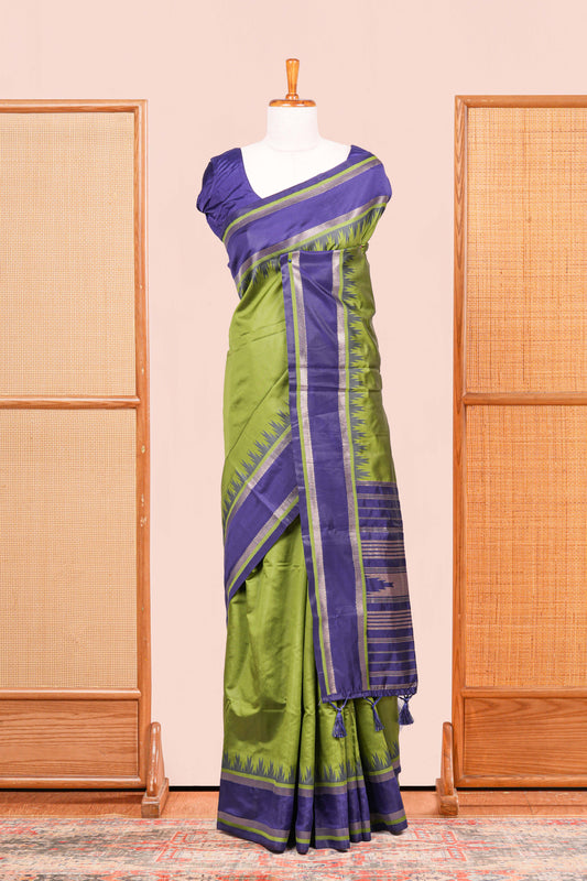 Green Art Silk Saree Body Plain With Retta Petta Border Intricate Geometric Dimond Motifs In Pallu With Contrast Blouse