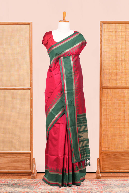 Maroon Retta Petta Art Silk Saree With Plain Body Retta Petta Border Contrast Intricate Gold Zari Stripes Pallu Along With Geometric Motifs Blouse