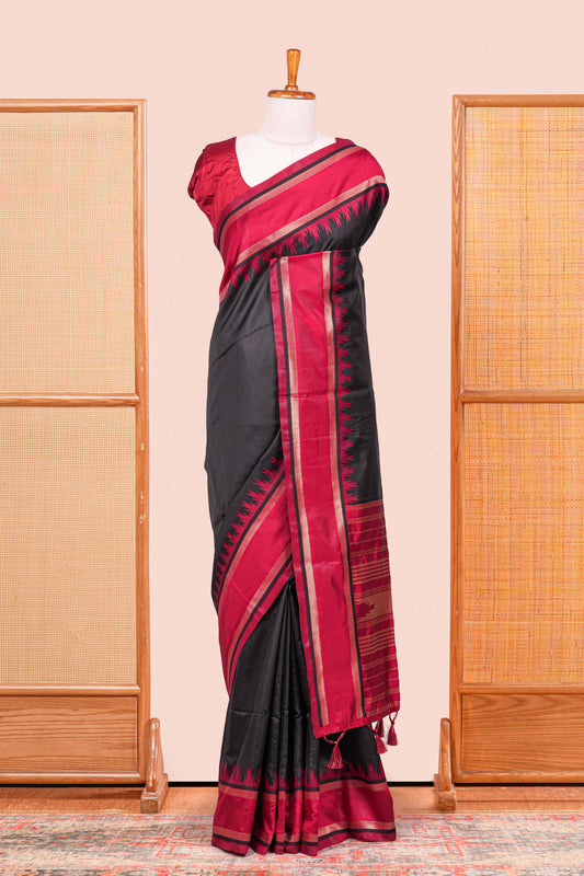 Black Art Silk Saree With Plain Body Contrast Gold Zari Stripes Pallu
