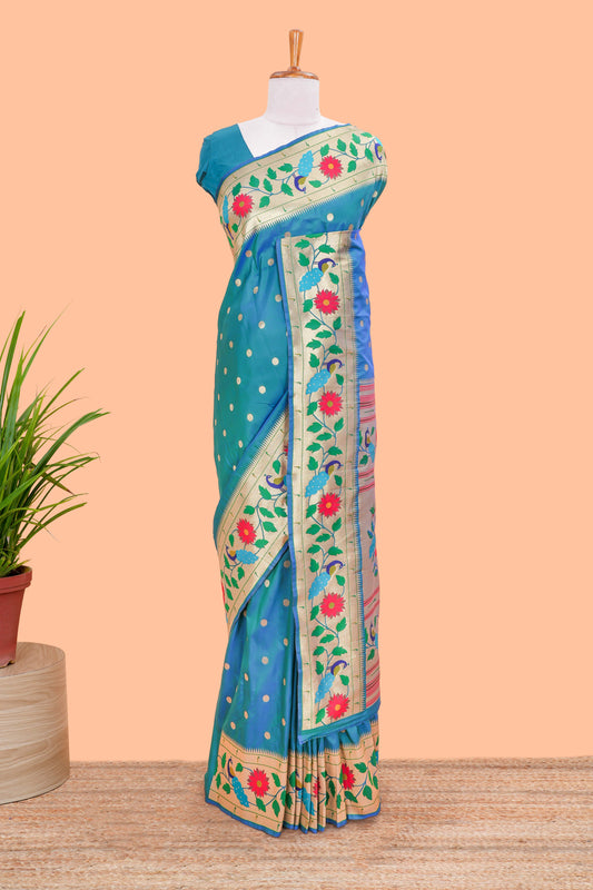 Peacock Blue Art Silk Saree Golden Zari Paisa Motifs Across The Body & Paithani Pallu Along With Blouse