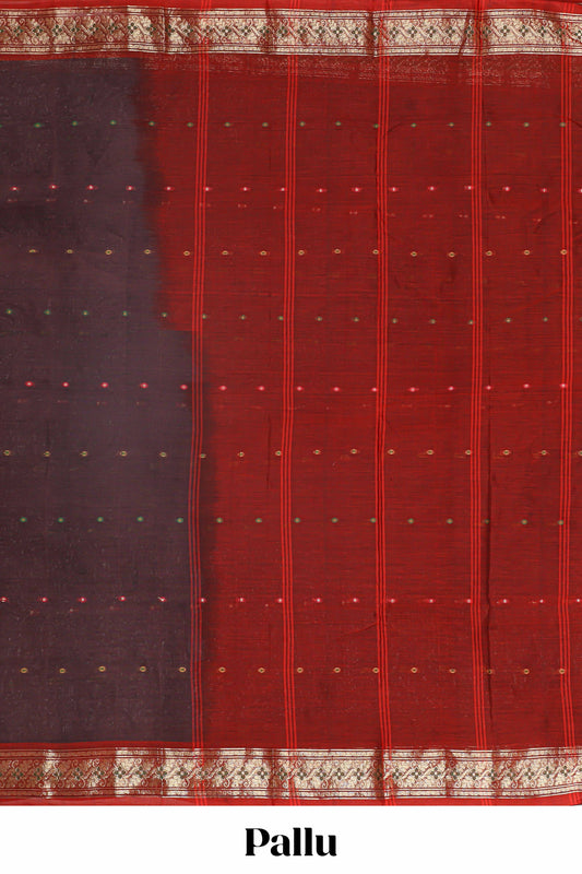 • Brown butta bengal cotton saree with contrast border and striped pallu