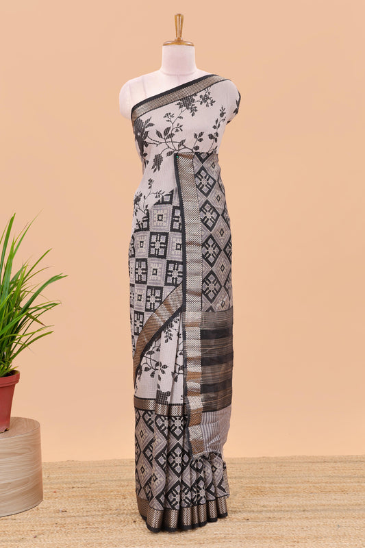 Grey checked chanderi cotton saree with floral design, contrast geomentric zari border