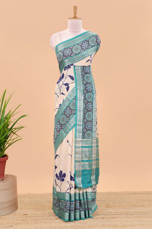 Cream paisley print chanderi cotton saree with contrast zari border and pallu