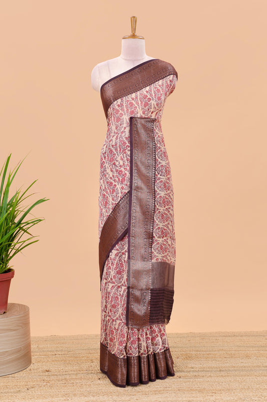 Sandal floral print chanderi cotton saree with contrast zari design border and stripes pallu