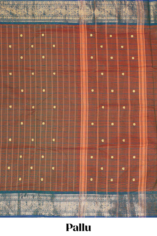 Brown checked zari butta chettinad cotton saree with contrast zari border and striped pallu
