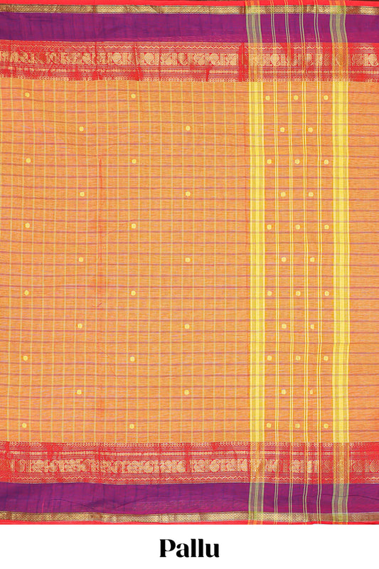 Orange checked zari butta chettinad cotton saree with contrast zari border and striped pallu