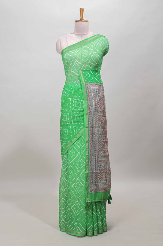 Green geometric pattern bandhani style linen cotton saree with self zari border and contrast printed pallu & blouse