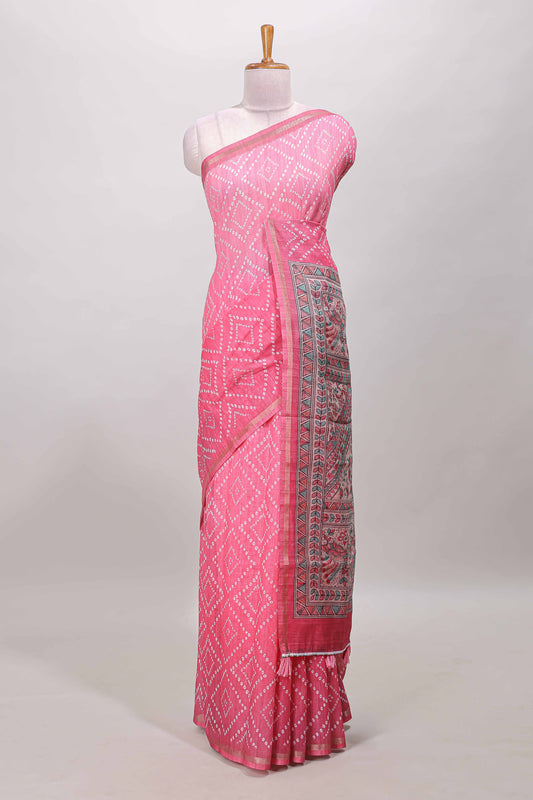 Pink geometric pattern bandhani style linen cotton saree with self zari border and contrast printed pallu & blouse