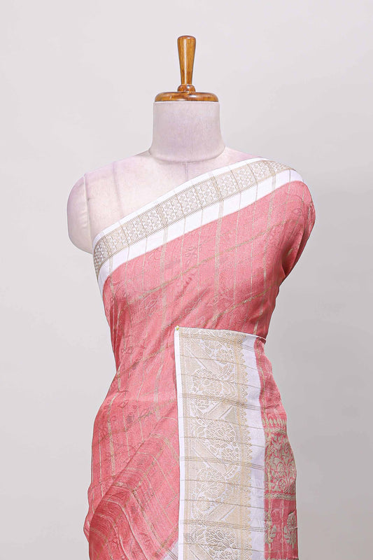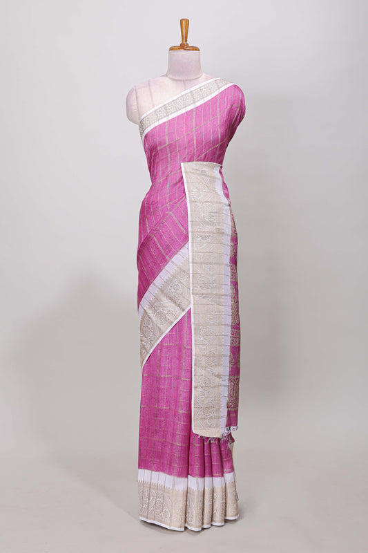 Pink checks marsh mellow gulab floral print saree with gold zari border and blouse
