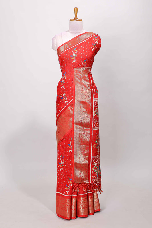 Red marsh mellow Ikkat floral and dotted butta saree with zari border