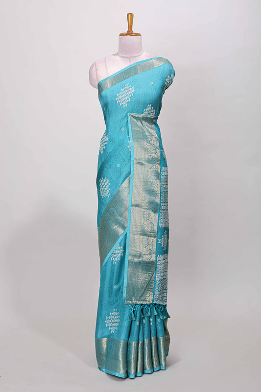 Blue marsh mellow floral butta saree with gold zari border and printed blouse