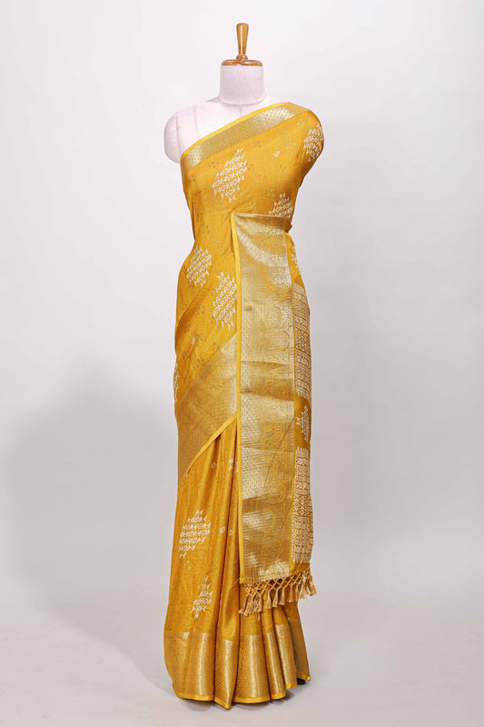 Mustard marsh mellow floral butta saree with gold zari border and printed blouse