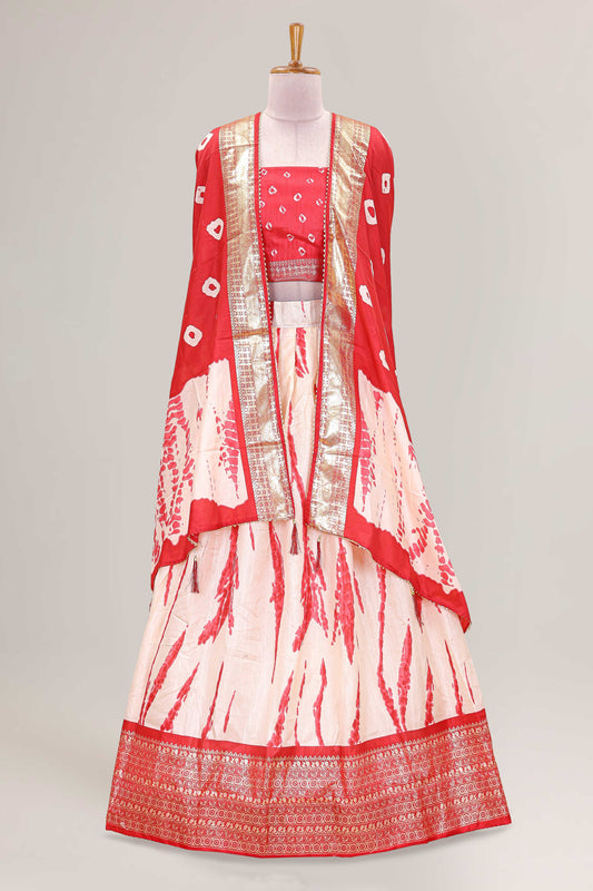 Cream dola silk bandhani designer lehenga with contrast blouse and dhavani