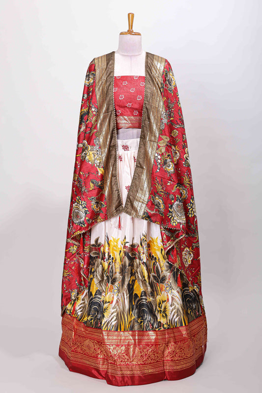 Cream dola silk floral printed lehenga with contrast blouse and dhavani