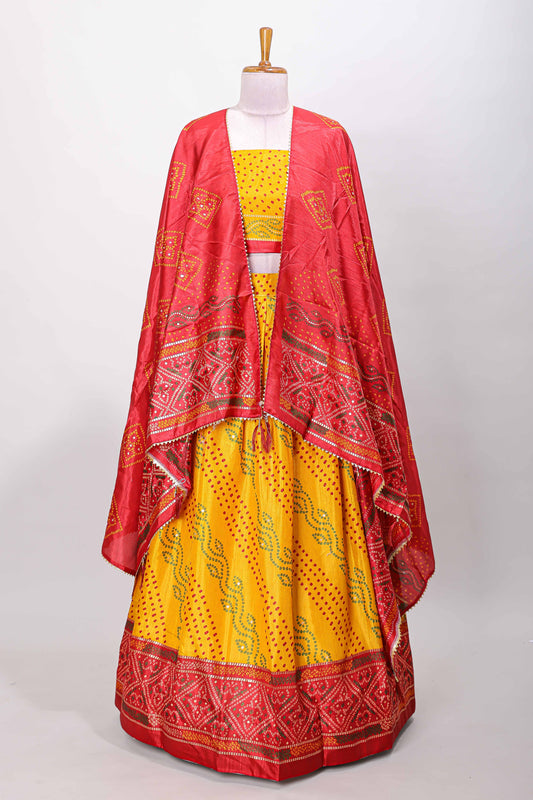 Yellow dola silk bandhani dotted stripe lehenga set with contrast dhavani