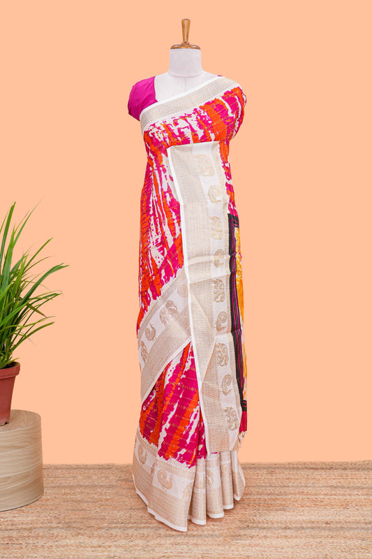 Dolo Silk Saree With tie and dye Abstract Print all Over Body with Kanchipuram Border and Rajastani Village art Pallu and Floral Print Blouse