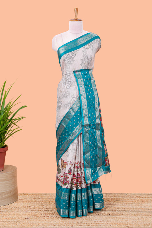 Green Mars Georgette Body Floral Print With Contrast Bentex Border Above Kalamkari Print With Kalamkari Pallu