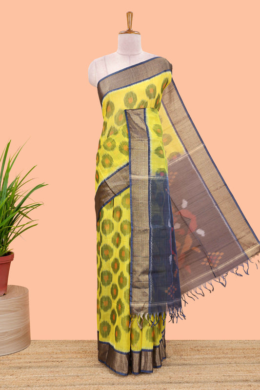 Yellow ikkat cotton saree featuring traditional pochampally motifs and zari border