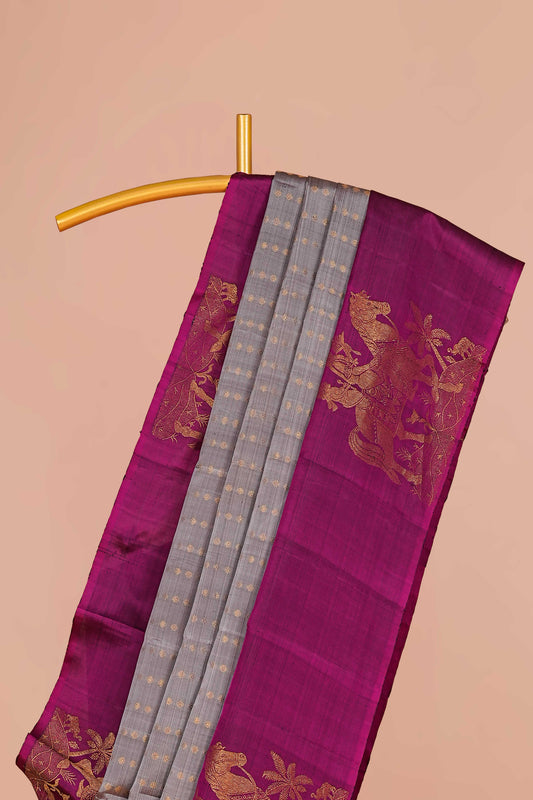 Sold outGrey Body with Wine Contrast Border Kanchipuram Pure Silk Saree featuring Lion Motif Zari Weaving