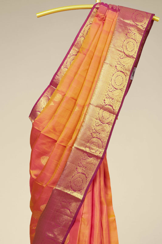 Sold outKanchipuram Traditional Silk Saree in Orange with Pink Contrast Border